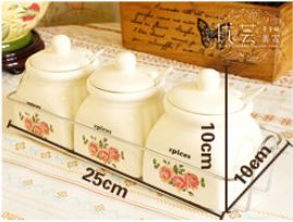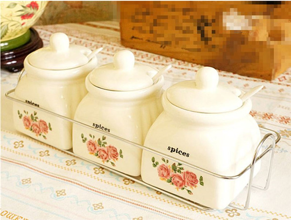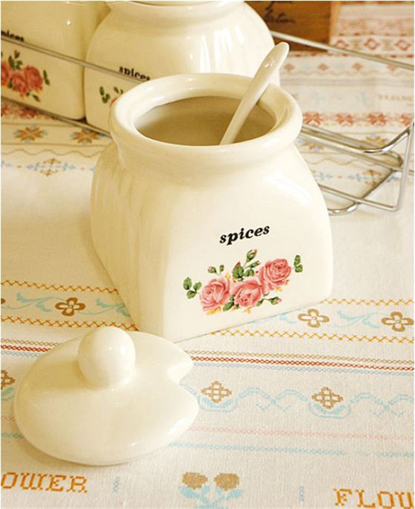 中式玫瑰花陶瓷調味瓶4件裝帶勺