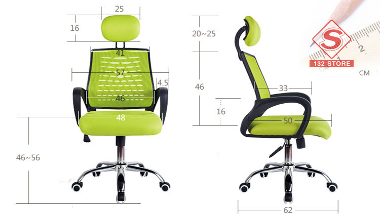 商品規格 尺寸: 見下圖 包裝尺寸 (長X寬X高): 56X27X55CM 組裝難度: 簡單 坐面材質: 網布 是否可升降: 是 是否可旋轉: 是 是否支持人體工程學: 是 凳腳材質: 鋼制腳 顏色: 綠色、藍色、粉紅色、黑色、燈色