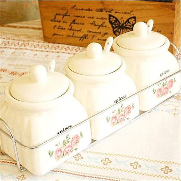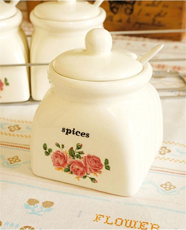 中式玫瑰花陶瓷調味瓶4件裝帶勺